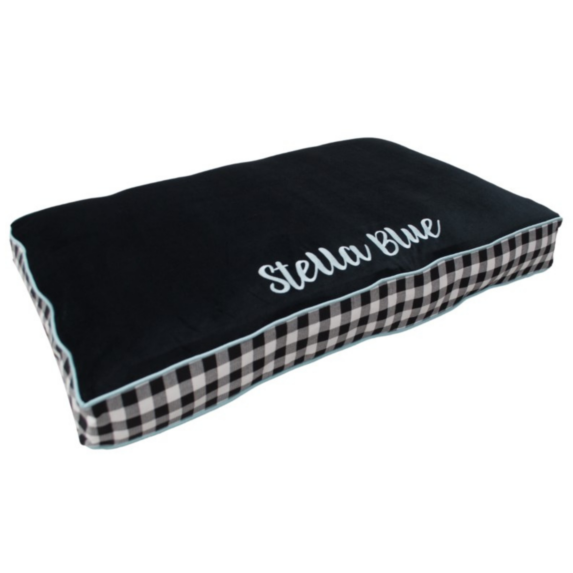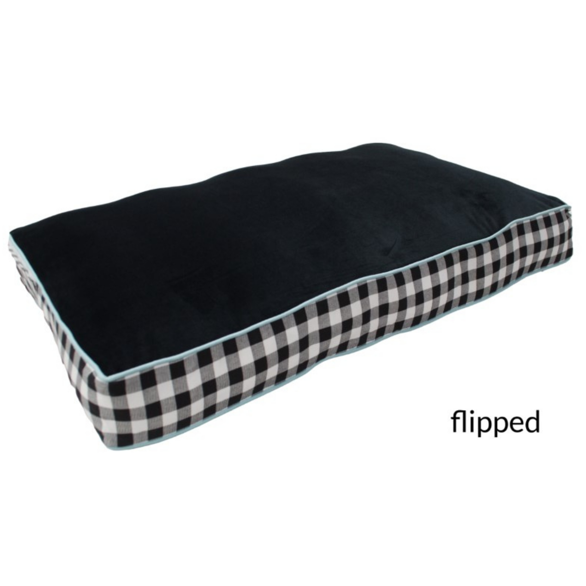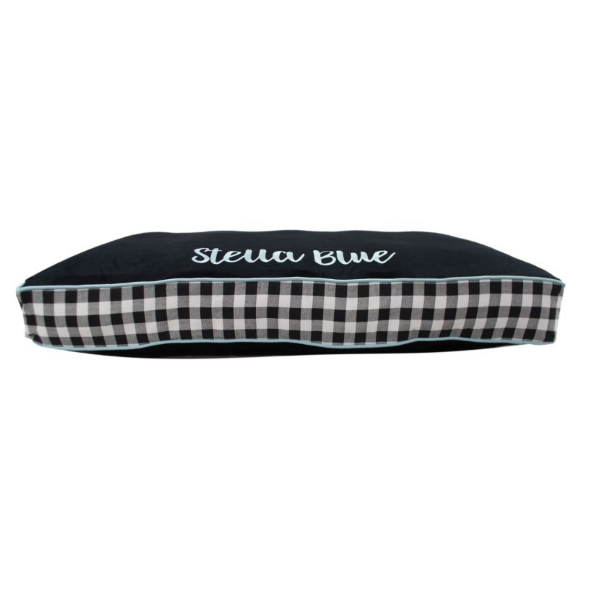 Does your dog enjoy the finer things in life? Are they too classy for loud prints and dancing flamingo patterns? Then check out this fancy little number...With polyester Black Micro Velvet top and bottom fabric rated for an insane 50k+ Double Rubs (15,000 is considered heavy use), you don't have to sacrifice durability or comfort to be a showstopper. Spa Blue cotton accent cording and stately Black-and-White Plaid cotton banding (the sides/"depth" of the bed) will ensure that your dog looks their best while while getting their rest!