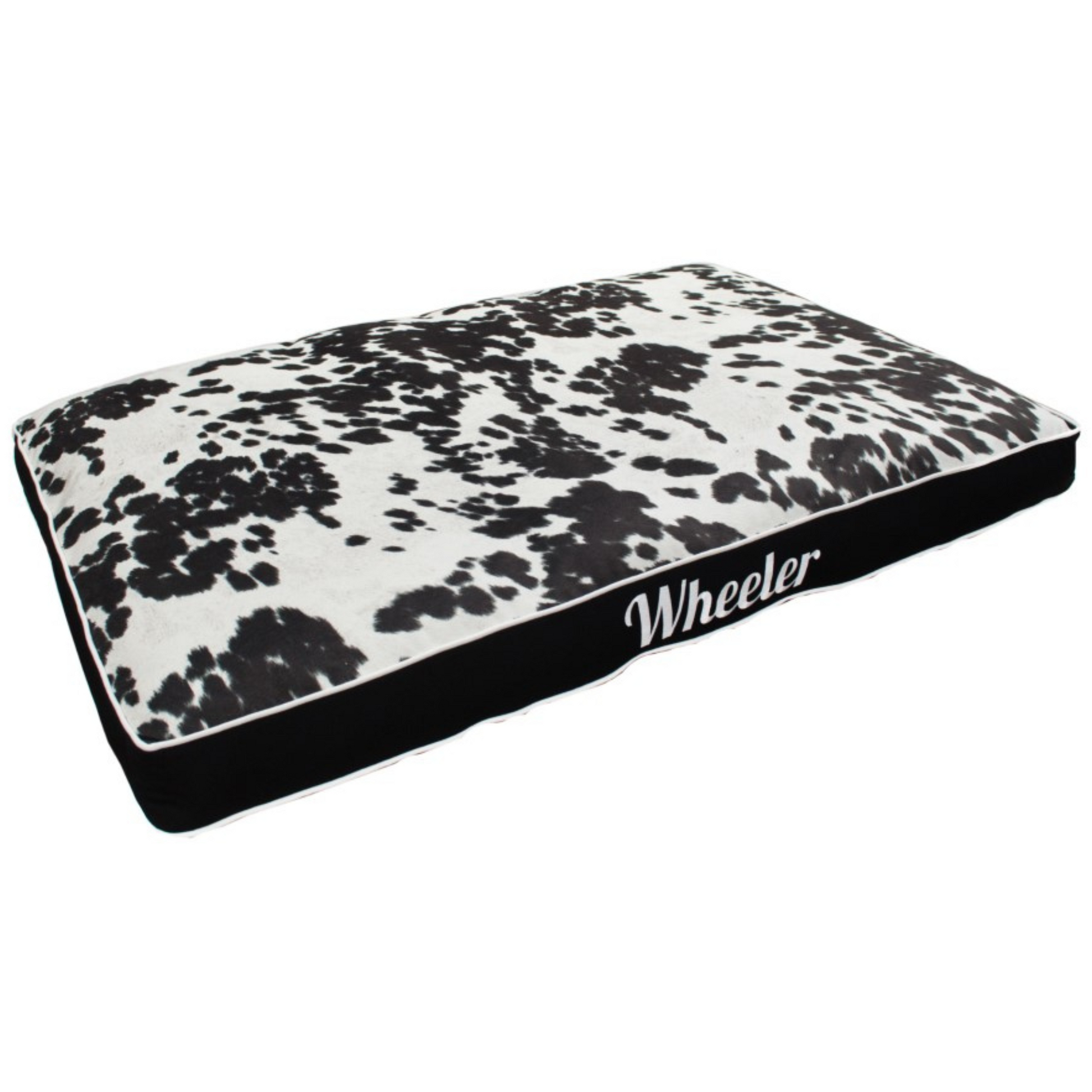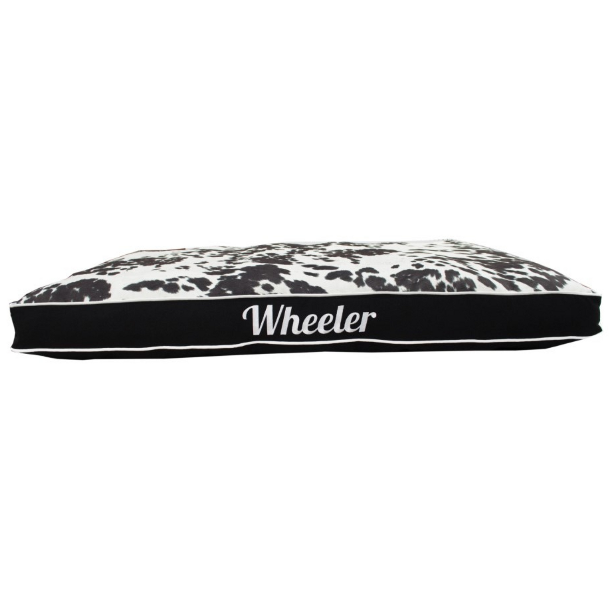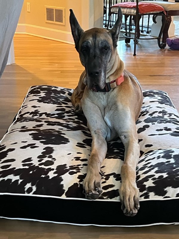 You've found it...the perfect bed for your house cow. With durable Black Faux Cowhide rated for 25k-49k Double Rubs (15,000 is considered heavy use) on both top and bottom, your dog can rest easy on this rugged, range-inspired custom luxe bed. Bull Denim Arctic White cording and Solid Black water repellent banding (the sides/"depth" of the bed), pull together this Clint Eastwood, tough-as-nails aesthetic. Even if your pooch didn't put in a hard day's work on the farm, this bed will help them rest like they did!