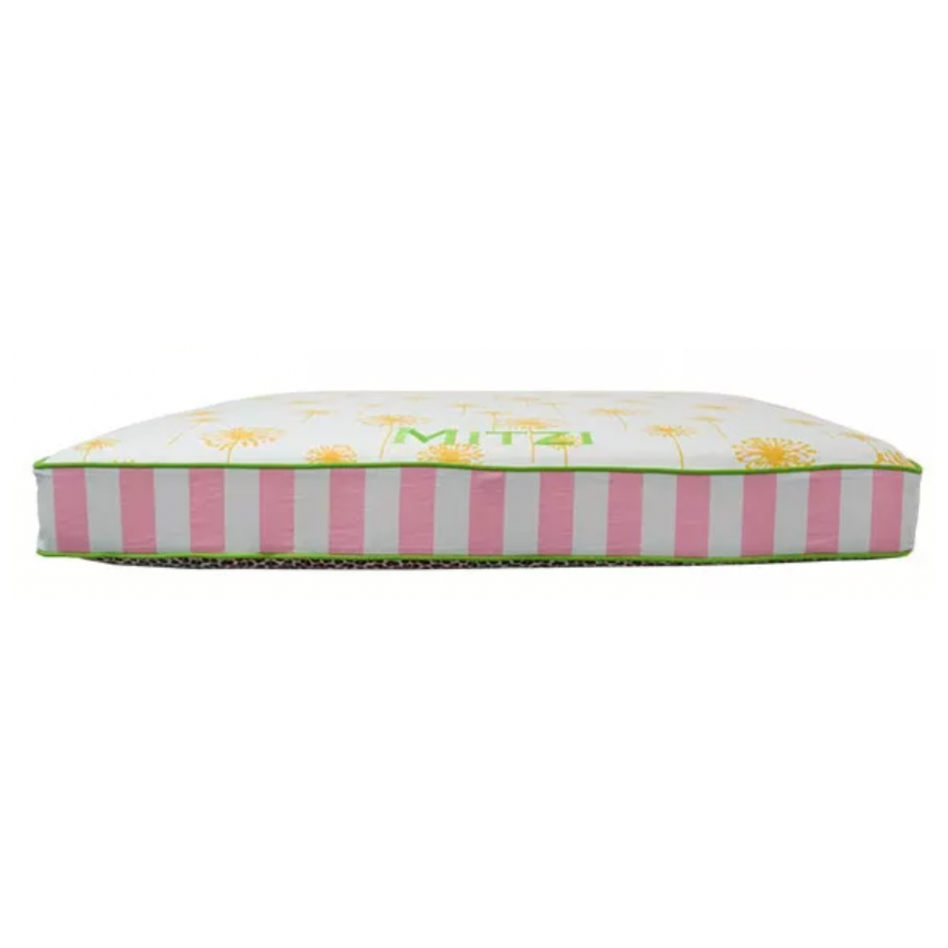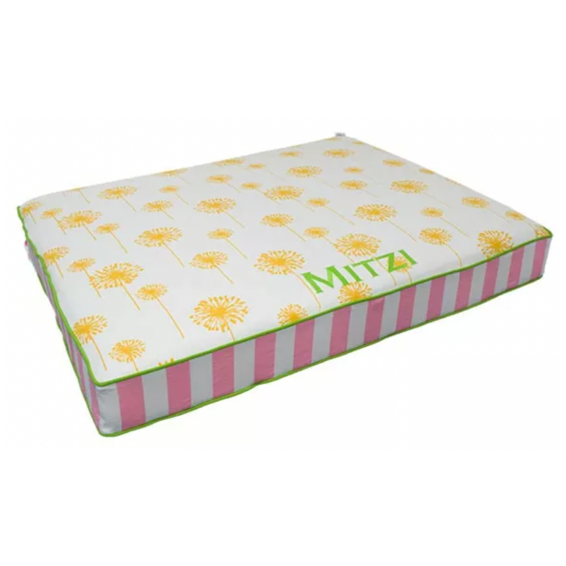 This one's a dandy...and we're not lyin'. This adorable piece is calming, floaty, and sure to brighten the room. With durable Dandelion Corn Yellow Slub Canvas top fabric rated between 25k+ and 49k Double Rubs (15,000 is considered heavy use), this bed proves that cute can pack a punch! Solid Chartreuse accent cording, Canopy Baby Pink banding (the sides/"depth" of the bed), and Amazon Sand bottom fabric will make sure that your big pup's furniture is popping.