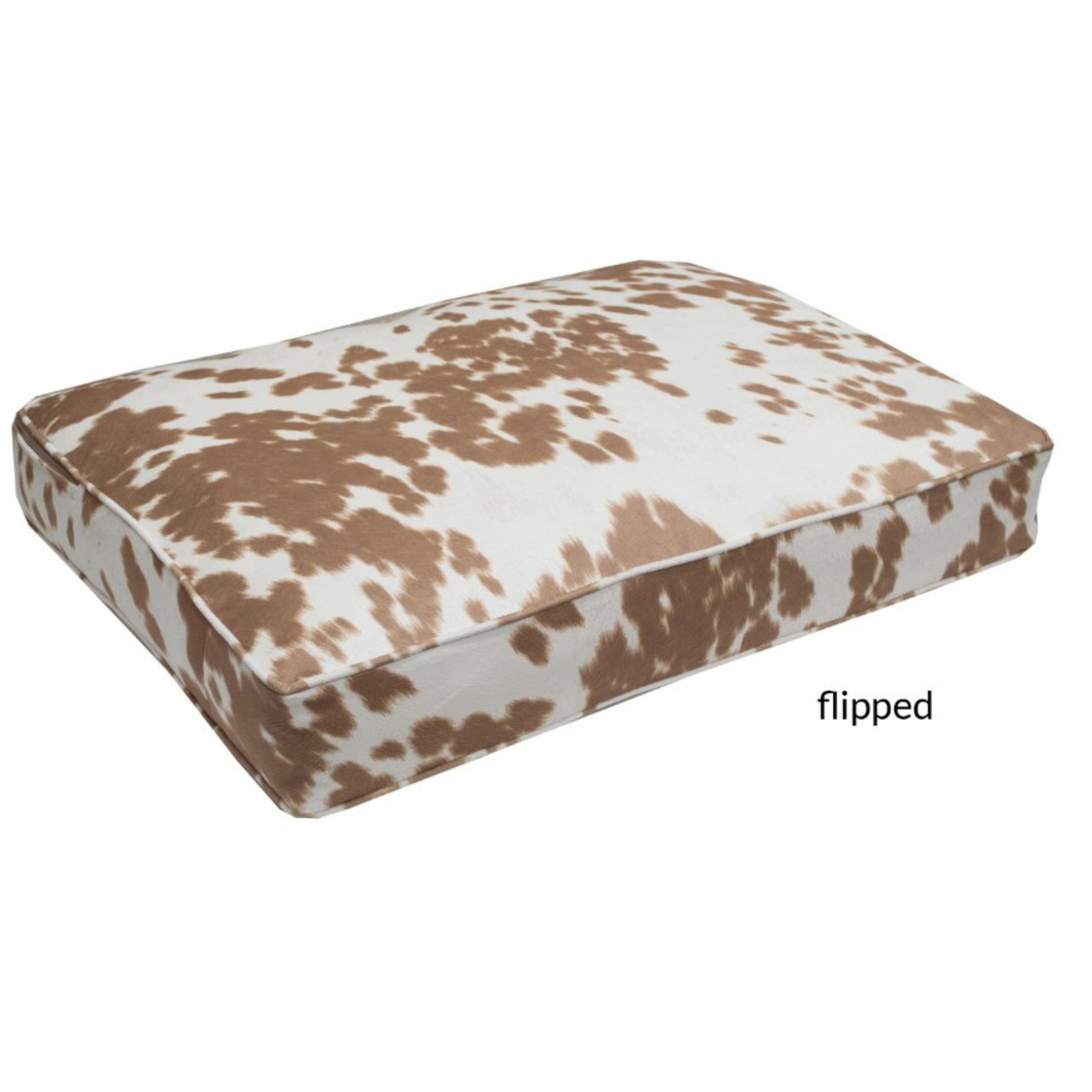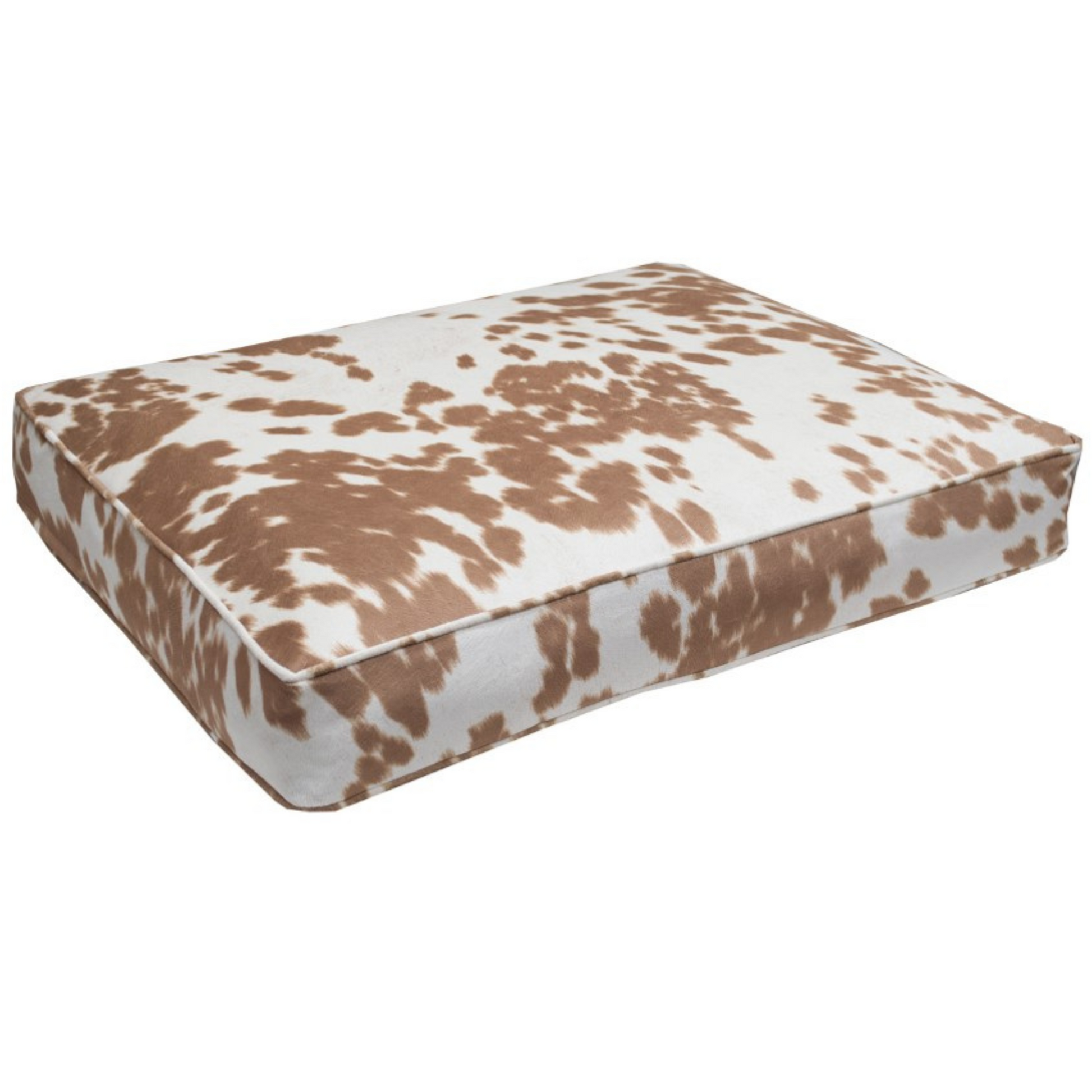 Are you ready to seize the moo-ment? With durable Palomino faux cowhide rated for 25k-49k Double Rubs (15,000 is considered heavy use) on both top and bottom, this stoutly designed dog bed will keep ticking long after the cows have come home. Matching cording and banding (the sides/"depth" of the bed) give your pup's new bed an aesthetic truly fit for a giant. You won't be sorry that your pup will be "hitting the hay" on this piece!