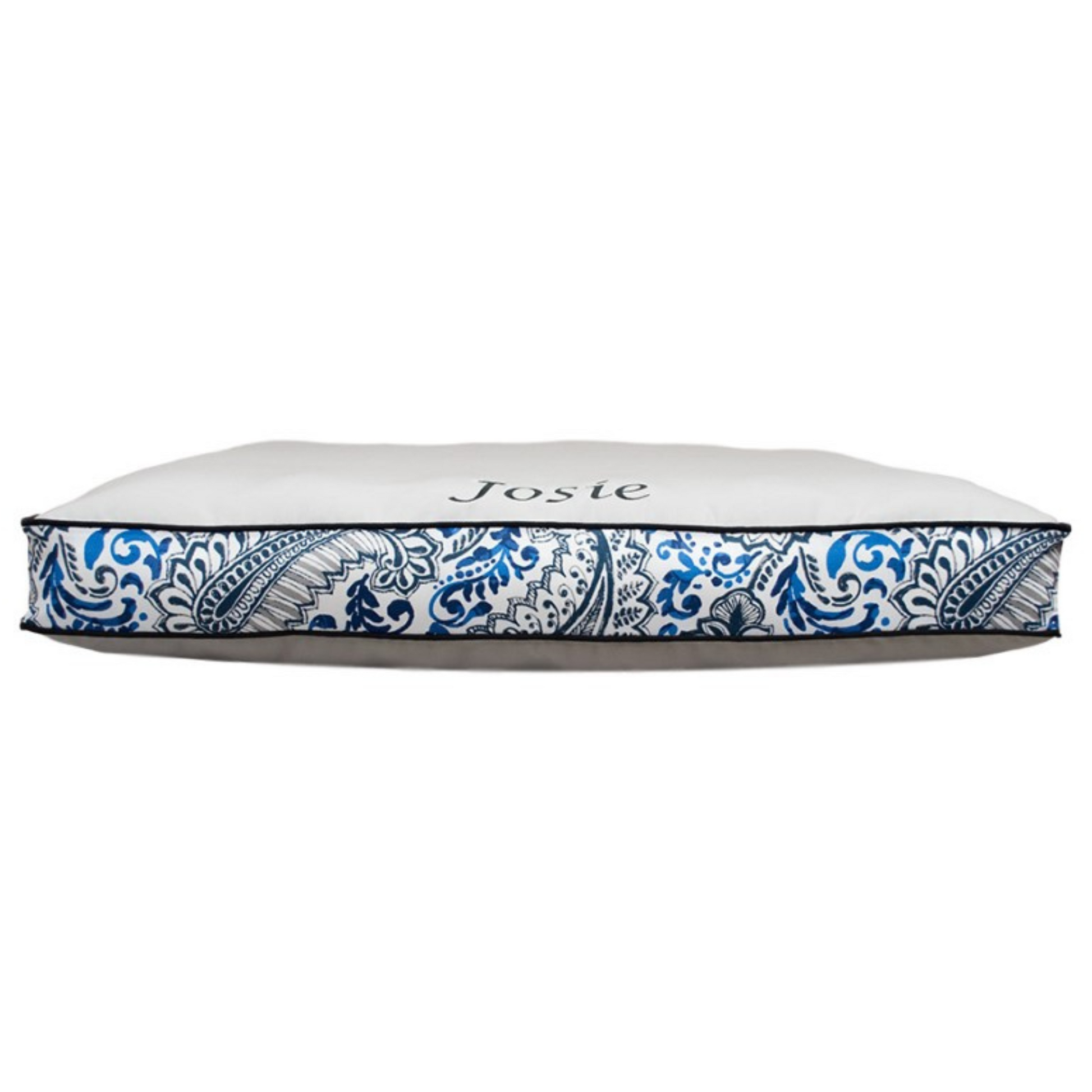 Playful, colorful, and resilient. Sounds like a triple-threat! With sturdy Solid Grey water repellent fabric rated at over 50,000 Double Rubs (15,000 is considered heavy use) on top and bottom, don't lose a bit of sleep over how this bed's high-traffic surfaces are going to hold up. Solid Black accent cording and Shannon Cobalt water repellent banding (the sides/"depth" of the bed) make this bed stand out in all of the right ways!